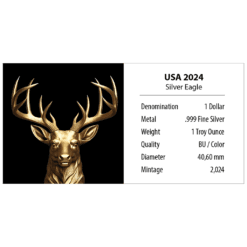 2024 Christmas Reindeer Coloured American Eagle Silver Bullion Coin, Christmas motif coloured 1oz silver Bullion Coin with a mintage of 2024.