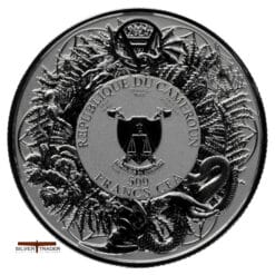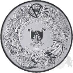 The obverse of the coin features the official markings of the issuer – the Republic of Cameroon. In the central part, there is the coat of arms of Cameroon, consisting of a shield supported by two crossed fasces (bundles of lictor’s rods), placed against the backdrop of a scale symbolizing justice. Above the coat of arms is Cameroon’s national motto: “PAIX – TRAVAIL – PATRIE” (“Peace – Work – Fatherland”), and below is the silver purity mark “Ag 999” along with the coin’s denomination – “1000 FRANCS CFA.”